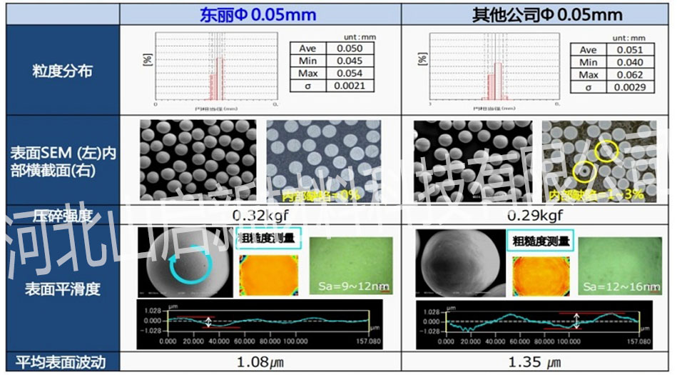 lφ0.1毫米以下的珠子在粒度分布和表面平滑度方面質量較高,平滑度是其他品牌的1.2-1.8倍,能有效提高粉碎效果