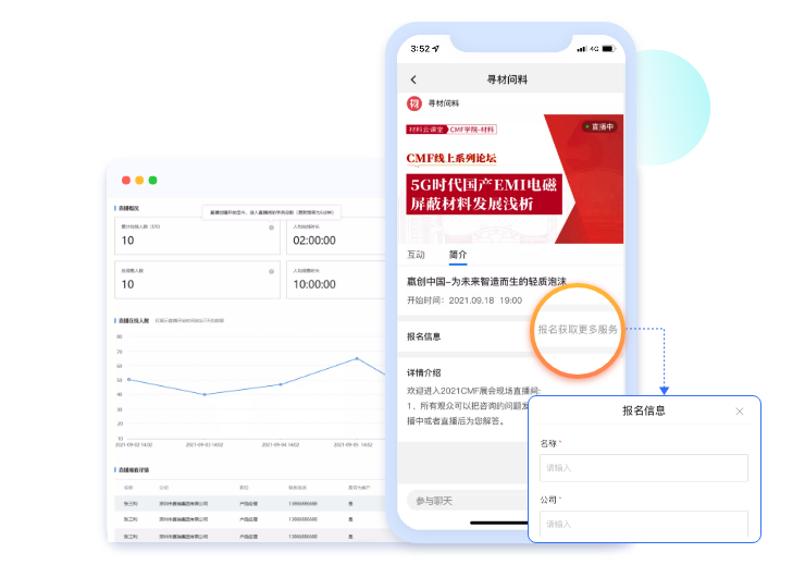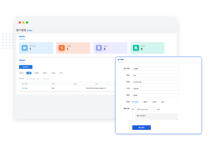 和我的電子名片、材料館訪客、直播報名觀眾等渠道打通??稍O置客戶來源,階段,跟進記錄。