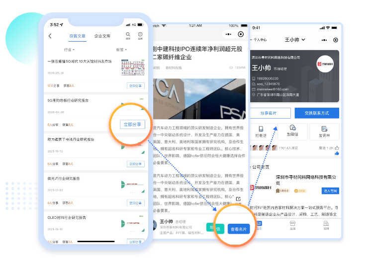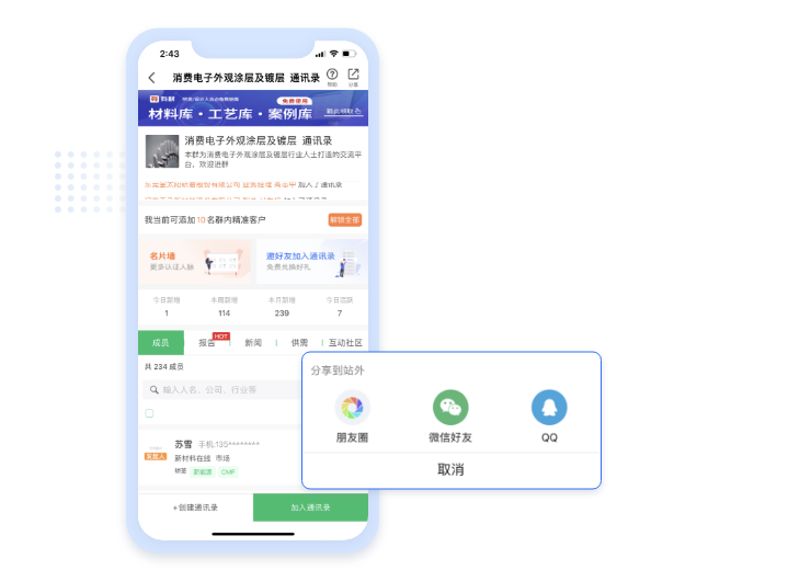 創建目標用戶相關的通訊錄,在朋友圈、微信等渠道分享邀請客戶加入,成員信息實時反饋到企業有材管理后臺。